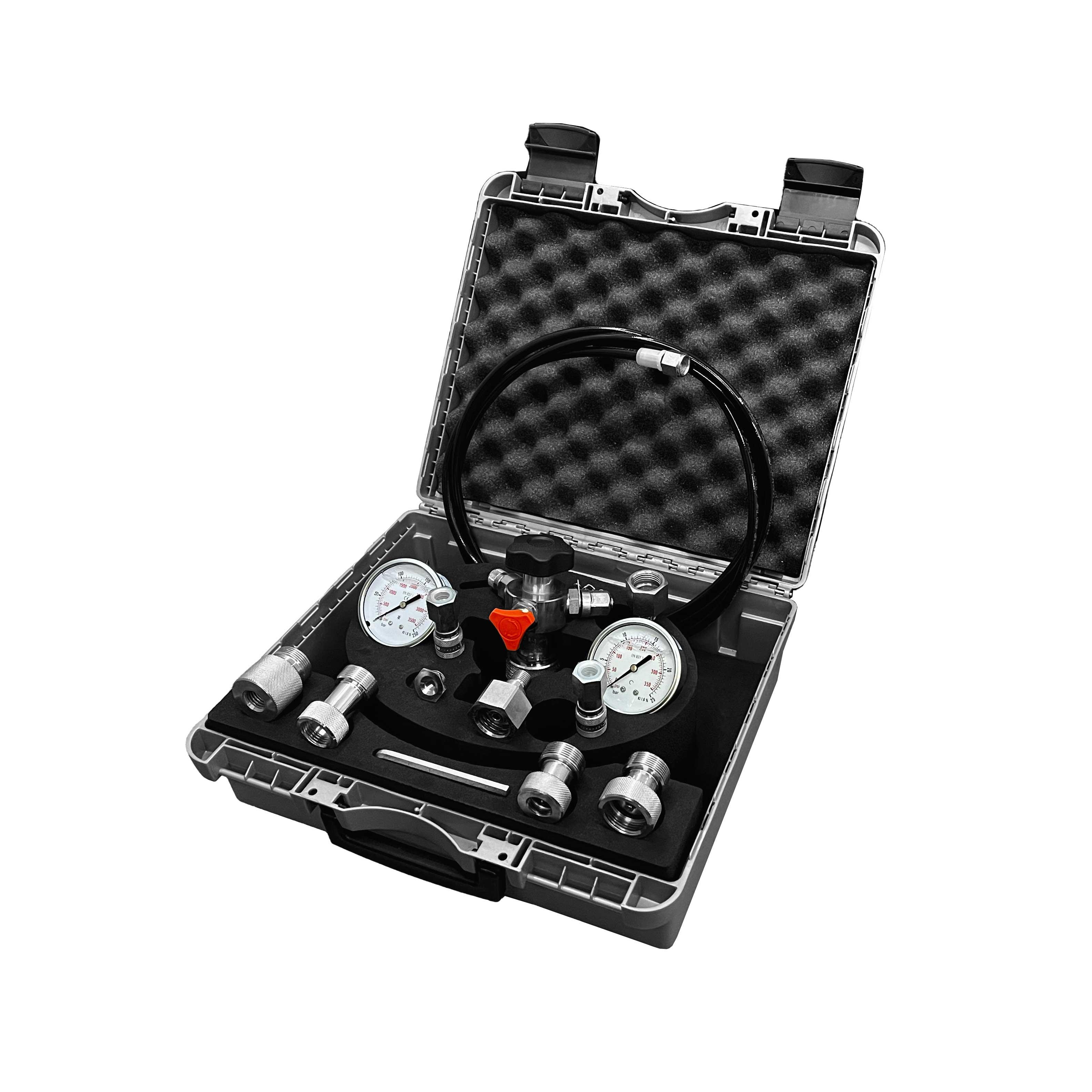 - Прилагаются два манометра (0-25 бар и 0-250 бар) с адаптером Адаптер для соединения тип шрадера Комплект уплотнений и ключ 6 мм A/F Allen