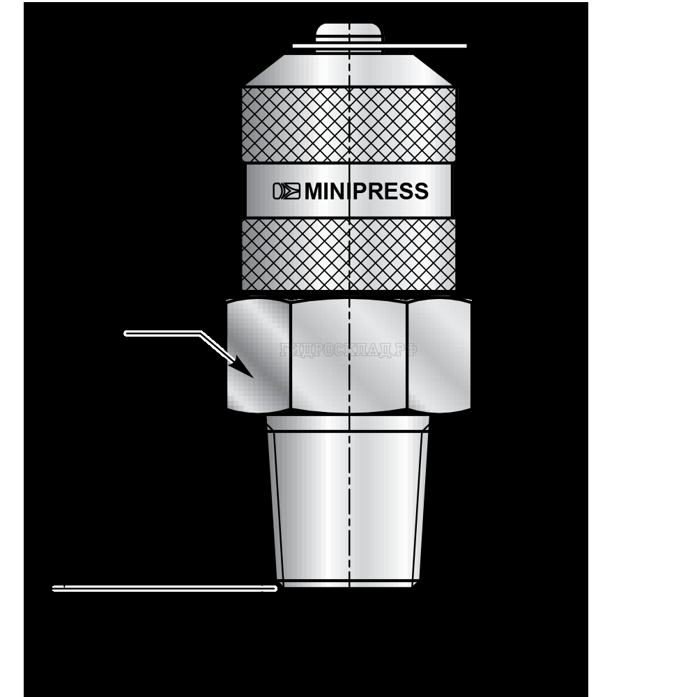 Главная страница→Каталог товаров→Контроль давления (Mini Press)→Точки контроля давления→Точка контроля давления M16x2 - R1/4" Type D (мет.колп.с цеп.) (Китай)