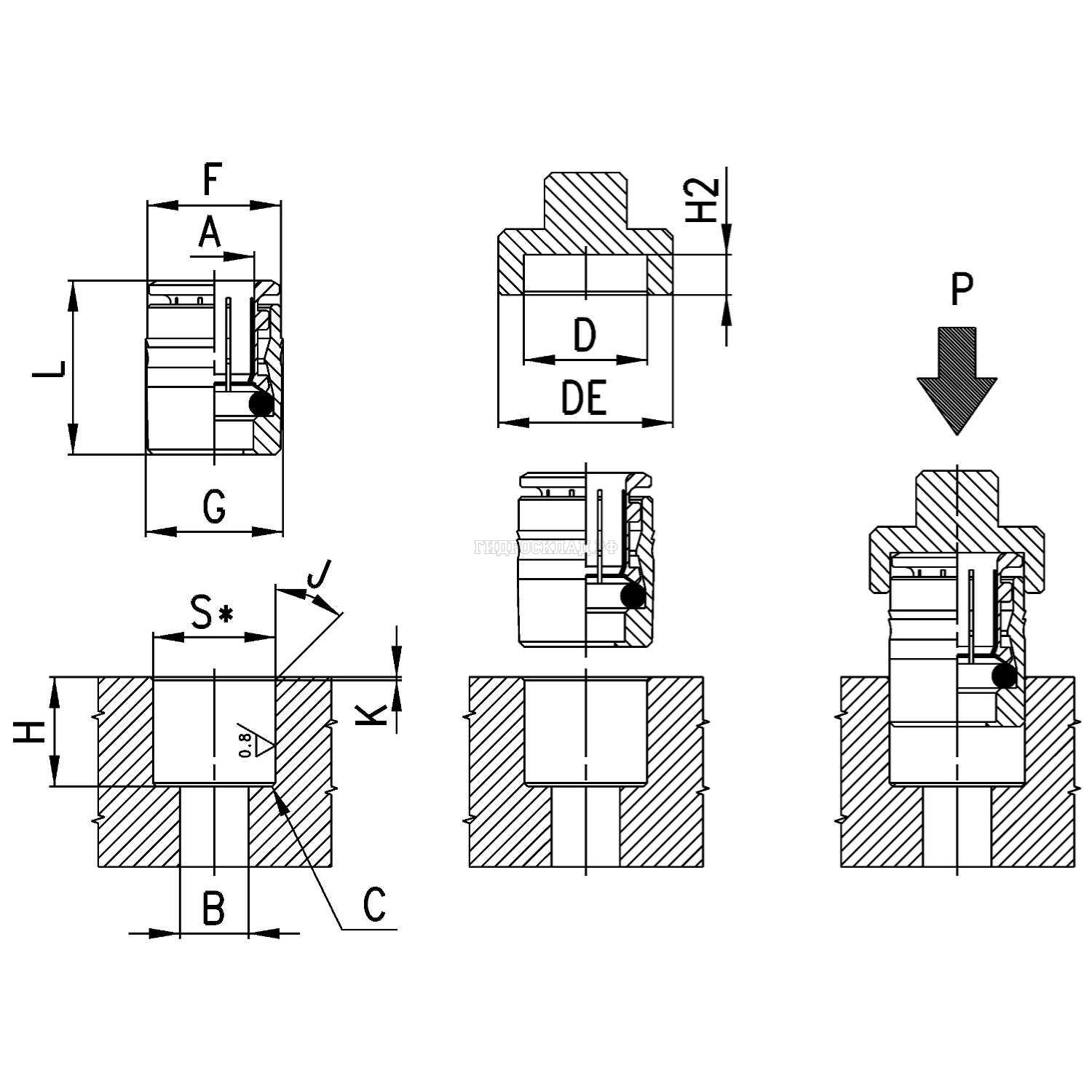 Главная страница→Каталог товаров→Пневматика→Фитинги и соединения→Фитинг цанга под запрессовку 0° P= 6мм - Ф=11.95мм (Camozzi)